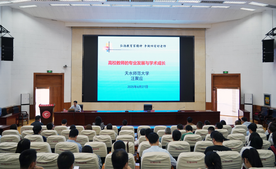 6月27日下午,新进教师教育教学能力提升培训第四讲在2号报告厅举行。校长汪聚应作题为《弘扬教育家精神 争做四有好老师——高校教师专业发展与学术成长》的专题辅导报告。各学院近五年新进专业技术岗位教师、思想政治教育专业硕士研究生等200余人参加报告会,报告会由教务处处长杨学良主持。