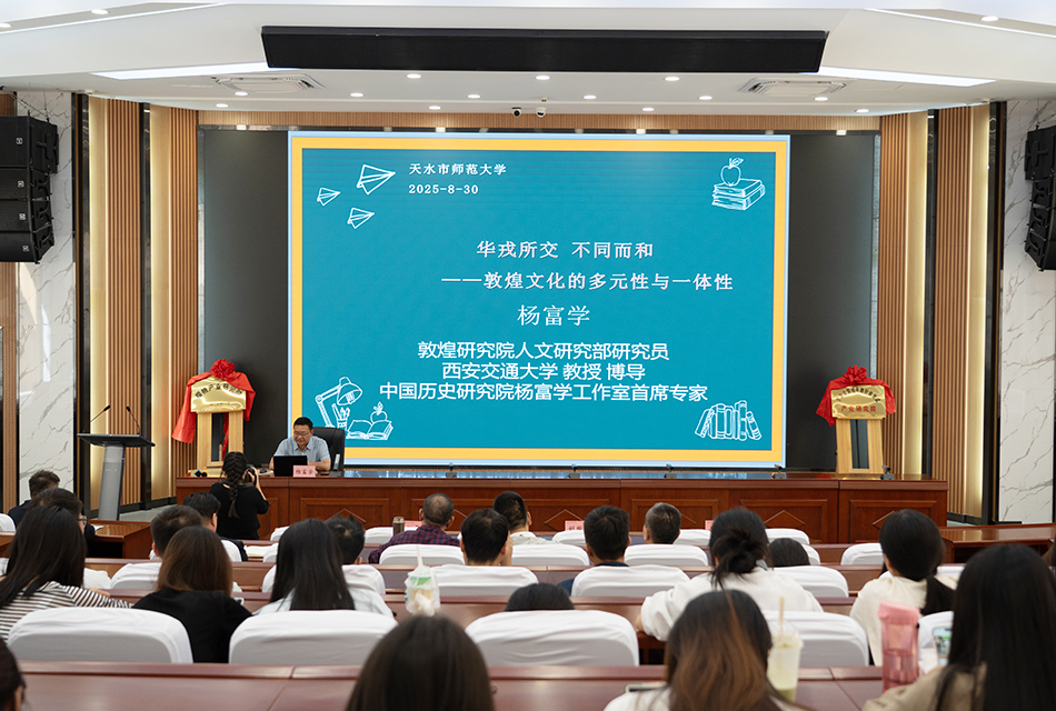 8月30日下午,敦煌研究院研究员杨富学应邀在我校四号报告厅作了题为《华戎所交不同而和——敦煌文化的多元性与一体性》的学术报告。报告由历史文化学院院长赵世明主持,学校师生代表共200余人到场聆听。