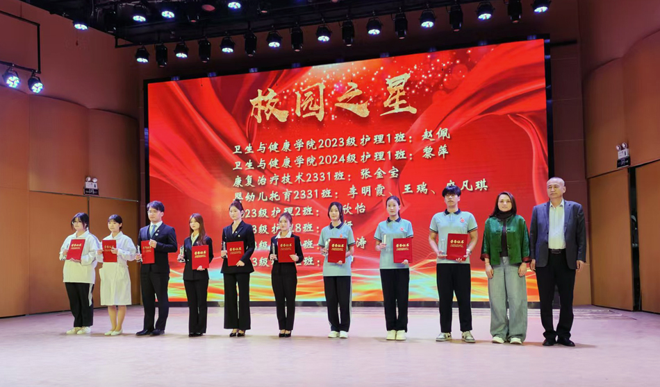 在授帽环节,邀请天水市第一人民医院、市第二人民医院、市第三人民医院和市中医医院的护理部主任为护理专业学生代表授帽,并举行学生代表宣誓仪式。卫生健康学院2023级护理1班学生赵佩、2024级护理1班学生黎萍被授予“校园之星”荣誉称号。