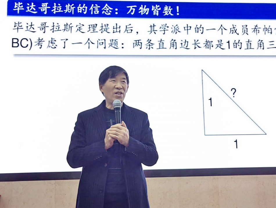 应数学与统计学院邀请,12月19日上午,国务院学位委员会数学学科评议专家、教育部数学专业教学指导委员会委员、南京大学博士生导师秦厚荣教授来校作题为《从勾股定理谈起》的讲座。学院部分教师、研究生及本科生等共300余人参加。