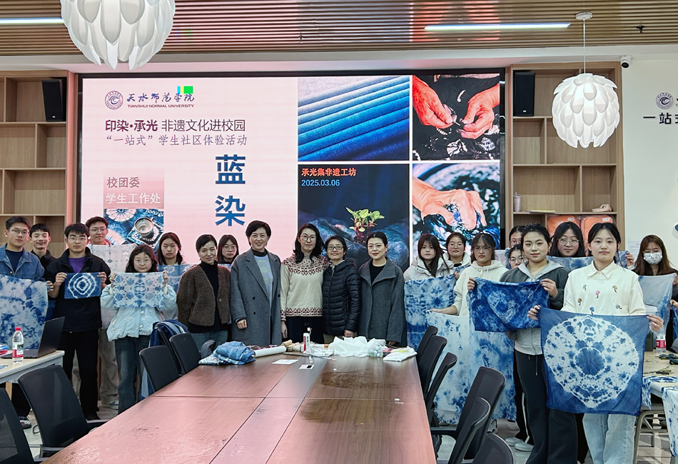 活动现场,天水市非遗传承人张艺馨老师通过展示“扎染”“蜡染”“夹缬”三大传统技艺的优秀作品,向同学们生动展现了植物印染工艺跨越千年的智慧与魅力。在张老师指导下,同学们亲手操作,从设计图案到捆扎布料,再到浸染固色,每一步都体现了同学们对传统印染工艺的热爱与探索。