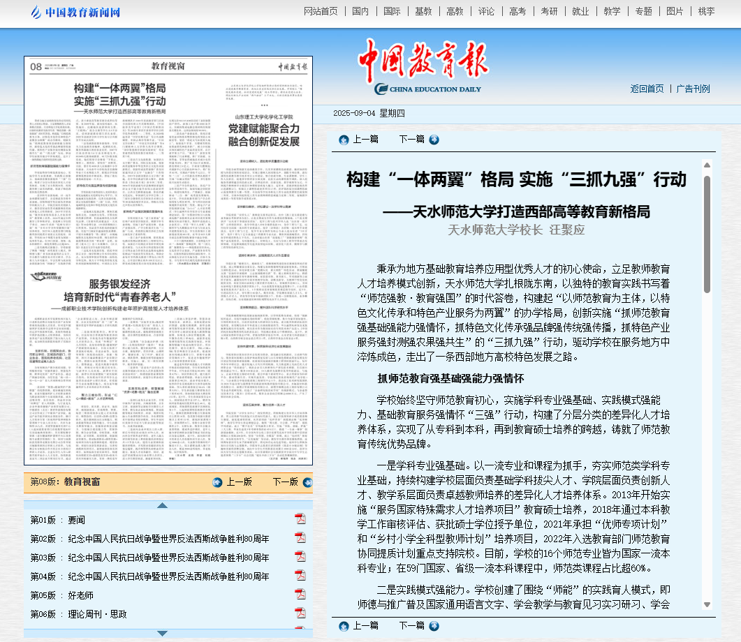 秉承为地方基础教育培养应用型优秀人才的初心使命,立足教师教育人才培养模式创新,天水师范大学扎根陇东南,以独特的教育实践书写着“师范强教·教育强国”的时代答卷,构建起“以师范教育为主体,以特色文化传承和特色产业服务为两翼”的办学格局,创新实施“抓师范教育强基础强能力强情怀,抓特色文化传承强品牌强传统强传播,抓特色产业服务强封测强农果强共生”的“三抓九强”行动,驱动学校在服务地方中淬炼成色,走出了一条西部地方高校特色发展之路。
