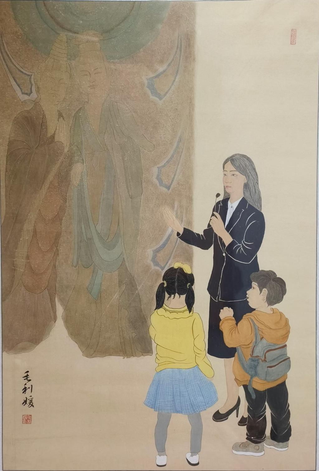 为了这幅画,毛利媛在麦积山泡了3个月。她观察游客的神情——有老人对着佛像落泪,有孩子模仿飞天的姿势,这些细节都被她捕捉进画里。