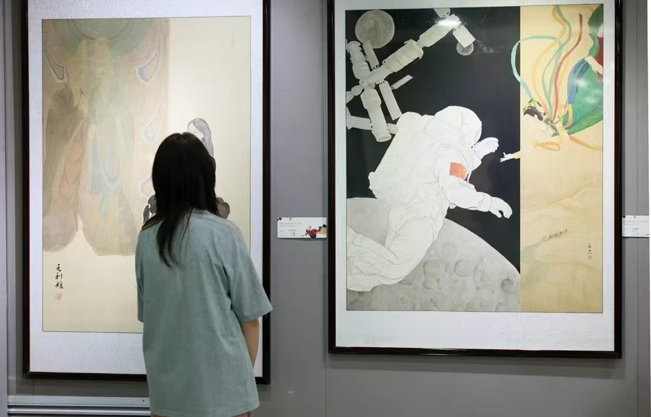 马云杰的毕业作品将石窟飞天与神舟十八号宇航员奇妙同框:“去年看到航天视频里的‘太空飞天’,突然想到麦积山壁画的‘满壁风动’——古人用艺术记录想象,我们为什么不能用现代视角重写故事?”他说。