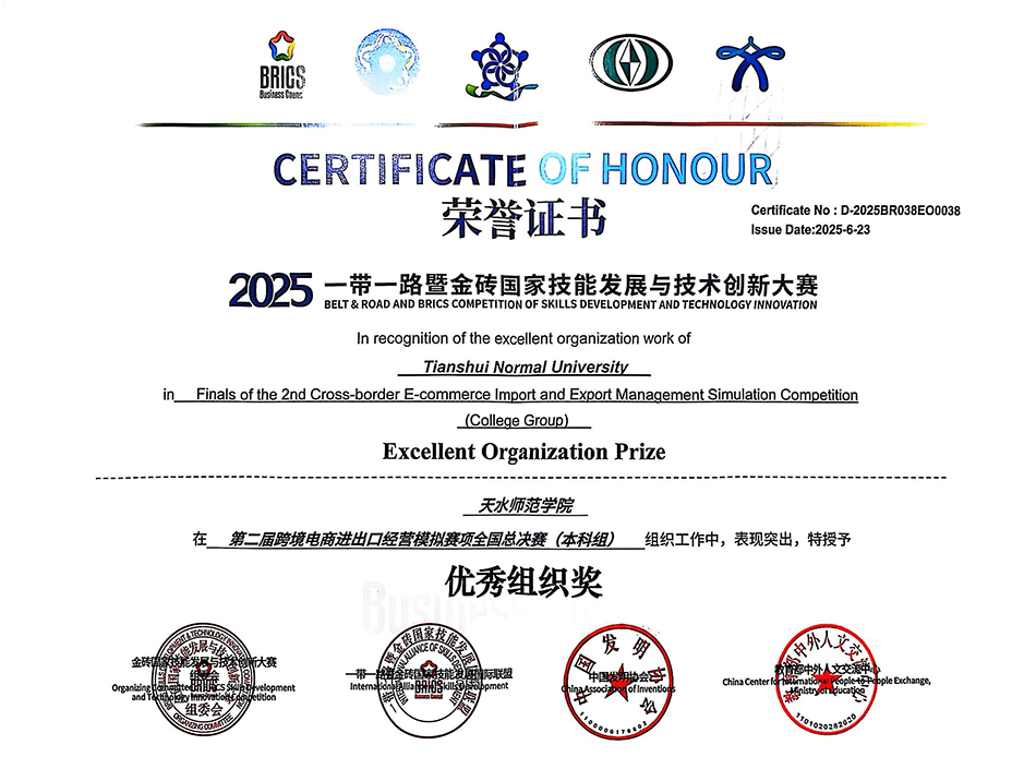 在2025年6月举行的“一带一路”暨金砖国家技能发展与技术创新大赛第二届跨境电商进出口经营模拟赛项全国总决赛中,我校商务英语系代表队凭借扎实的专业功底和卓越的实战能力,从全国50所参赛高校中脱颖而出,荣获二等奖,学校同时荣获优秀组织奖。本次大赛由金砖国家工商理事会技能发展工作组、“一带一路”暨金砖国家技能发展国际联盟、教育部中外人文交流中心等权威机构联合主办,旨在推动跨境电商领域的技术创新与国际化人才培养,吸引了近百所高校的精英团队同场竞技。我校代表队的优异表现彰显了学校在跨境电商人才培养方面的优势与实力。