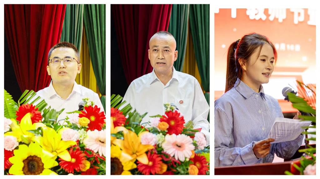 教师代表、卫生健康学院刘仁憨教授,新入职教师代表、教师教育学院教师王鐘,学生代表、商学院23级法学班学生刘璐分别作了发言。