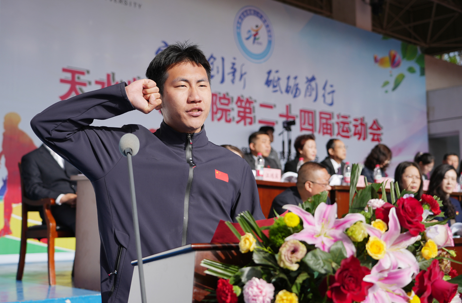 教师教育学院学生李欣毅和体育运动与健康学院教师赵瑞星分别代表运动员和裁判员宣誓。
