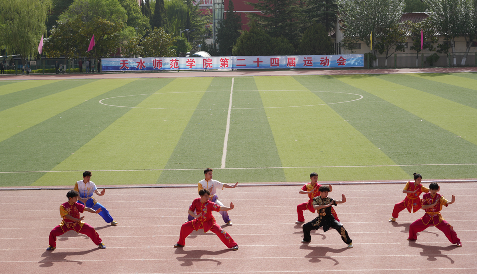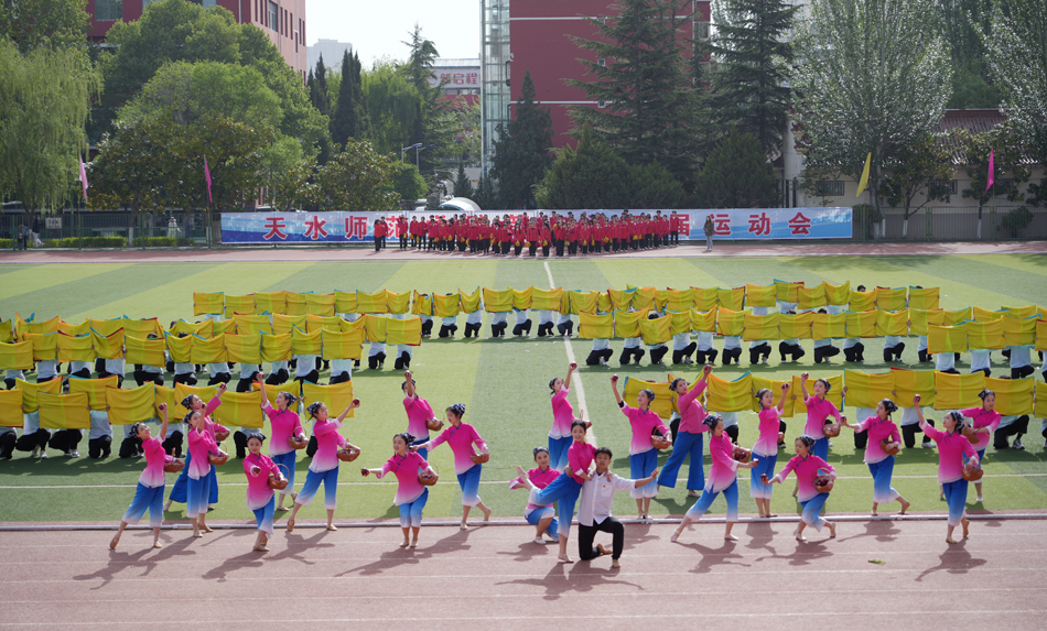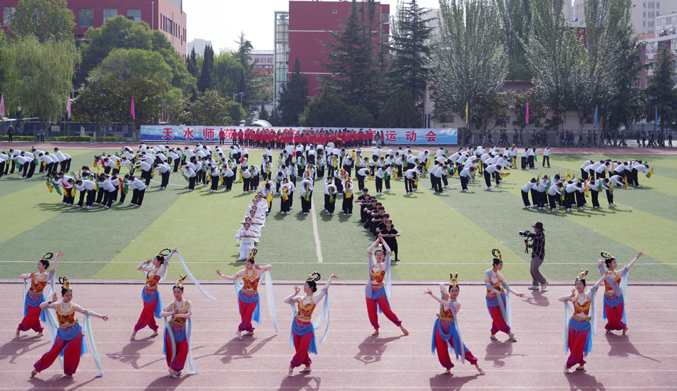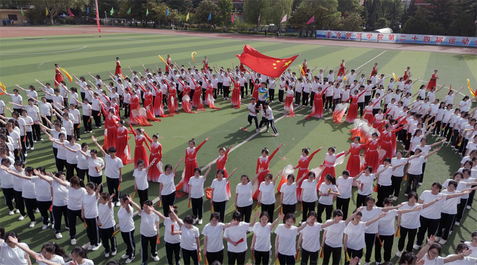 随后,开幕式团体操表演在绿茵场精彩上演,各学院以艺术与力量交融的表演诠释出师院学子的青春风采。体育运动与健康学院的《旋鼓》以雄浑鼓声拉开序幕,羊皮鼓面绘太极八卦,藤鞭击鼓间尽显甘肃民间艺术豪迈气魄;历史文化学院《历史拾光·幻彩成言》以红黄蓝三色浪潮演绎时空对话,太极彩扇翻涌伏羲智慧;机电与汽车工程学院《机电筑梦 智造未来》通过齿轮阵列,展现从1984年到2025年的奋进之路;音乐舞蹈学院《丝路师魂 筑梦新篇》将琴键幻化赛道,以敦煌舞姿点燃运动激情;马克思主义学院青春活力的《朝阳绽放 跃动青春》与外国语学院《扇舞星旗 语汇世界》的红金百扇矩阵形成鲜明对仗,体育运动与健康学院《中国武术》表演以刚柔并济的招式彰显千年武学传承,为开幕式画上圆满句号。